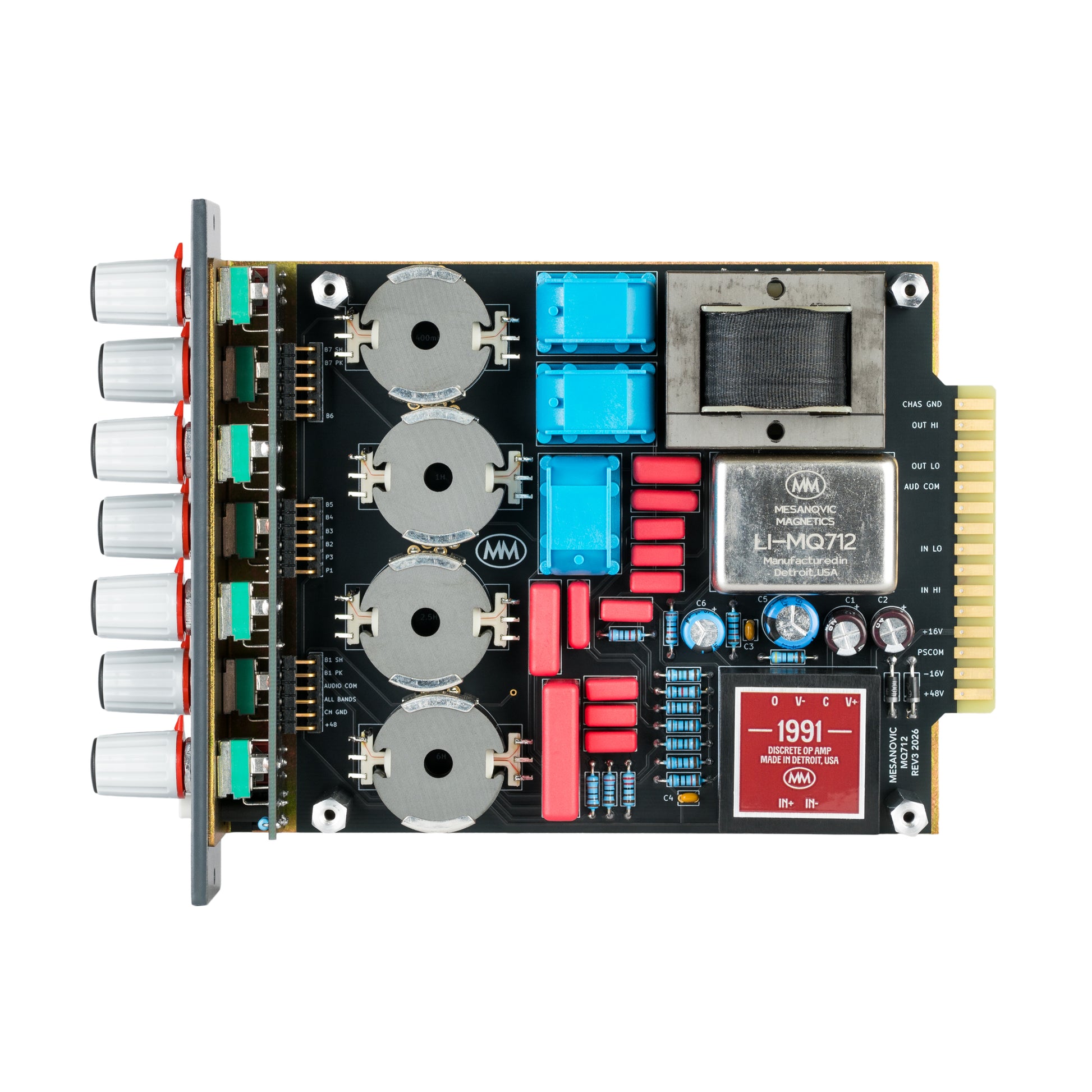 High quality components are used throughout the MQ712 including custom potentiometers, Wima/Vishay/Nichicon capacitors, and Ritel collet knobs. The unit is entirely built in-house in the USA.